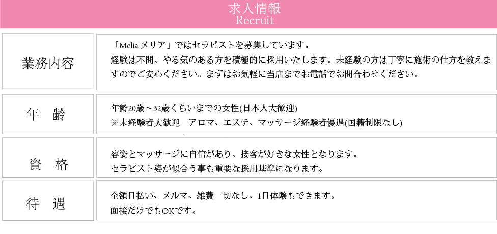 | 上品でおしとやかな麗しの美人セラピスト♪お客様のことを第一に考えた心のこもった接客に、心身共に癒したいと思う一生懸命な施術でお客様を魅了します。彼女と一緒に過ごす空間はまさに癒しの楽園と感じさせられることでしょう…。聞き上手な彼女に思わず心を打ち解けられ会話も弾むこと間違いなしです。 | 大きな胸の美女! マッサージ店での経験もありますので技術は全く問題ありません。 お客様の満足を第一に考えるおもてなしの精神に心がなごみます。 日頃の疲れを得意の指圧とヒジ押しでスッキリと取り払ってくれます。。 |
